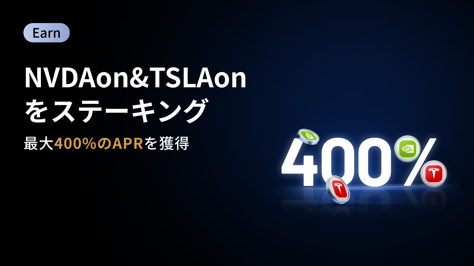 NVDAon & TSLAon ステーキング祭がついに開催!— 新規ユーザー限定、期間限定でご利用いただけます。今すぐNVDAonとTSLAonをステーキングして、驚異の400%のAPRを獲得しましょう。このまたとない機会をお見逃しなく!