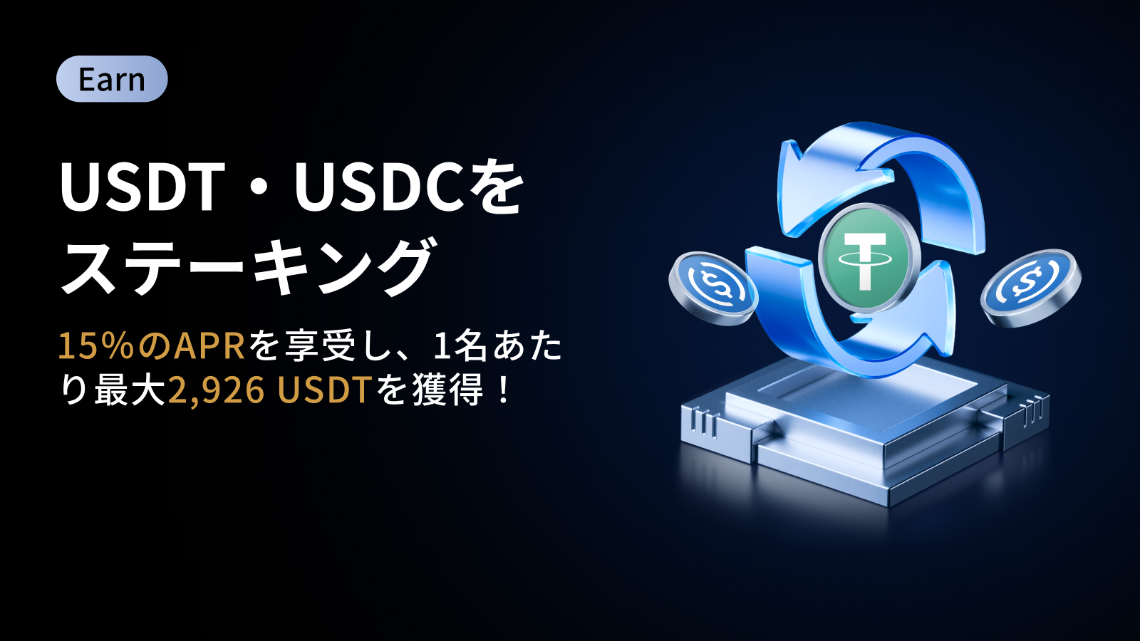 あなたの暗号資産をもっと賢く運用しましょう!MEXCは、フレキシブルな償還メカニズムを備えた「USDT & USDC ステーキング祭」を開催します。期間限定イベント中にUSDTまたはUSDCをステーキングすることで、最大15%のAPRを獲得でき、個人あたり最大2,926 USDTの収益を得るチャンスがあります。