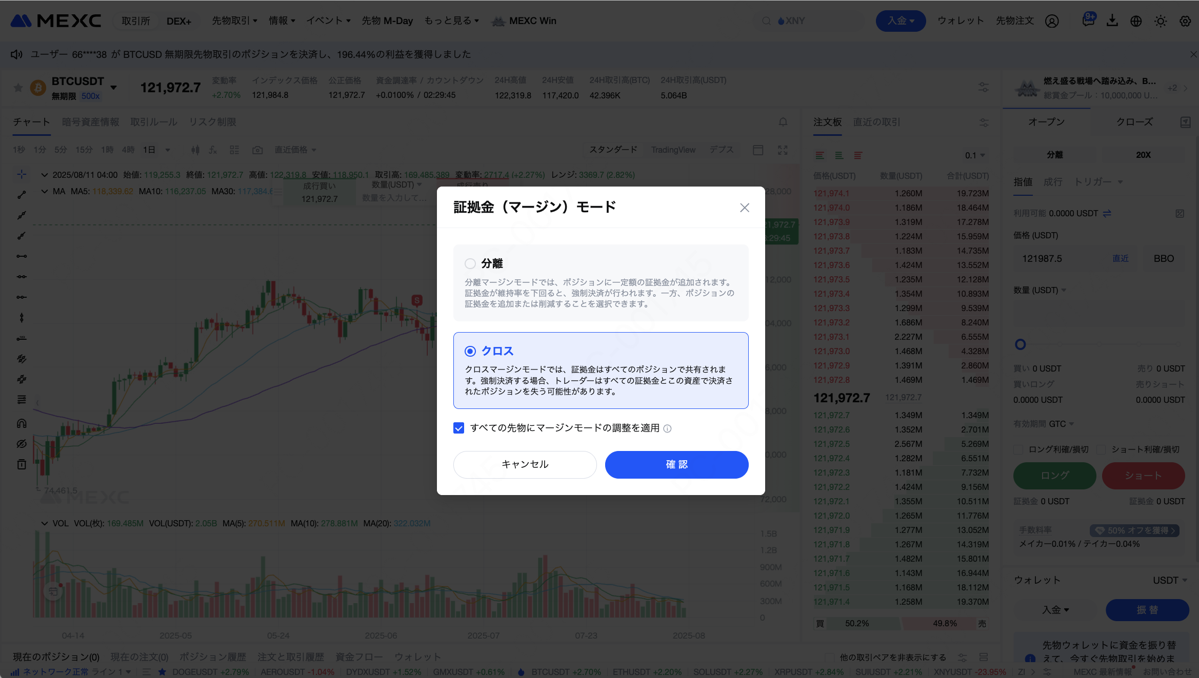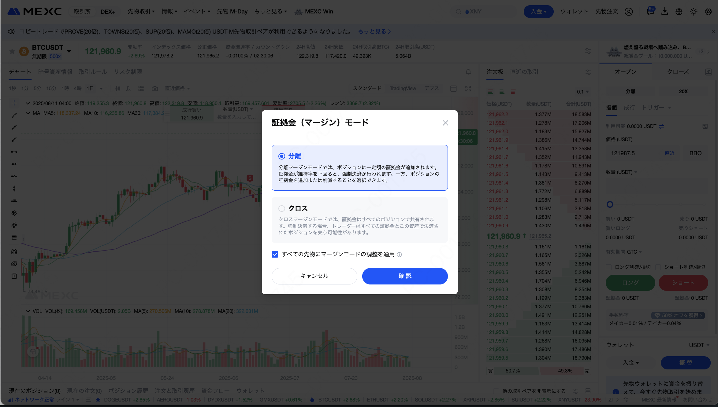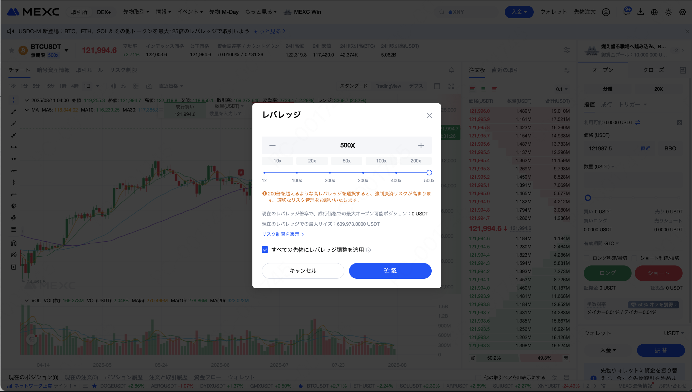 例えば、BTCUSDT取引では、MEXCは最大500倍のレバレッジを提供しています。しかし、新規トレーダーはまず2倍や5倍といった低倍率から始めることで、相場の動きに慣れ、徐々に保有ポジションの規模を拡大していくことが望ましいでしょう。