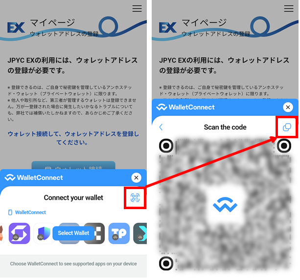 ①JPYC EXでWalletConnectのコードをコピーします。