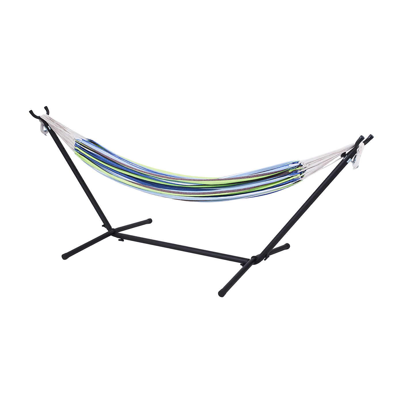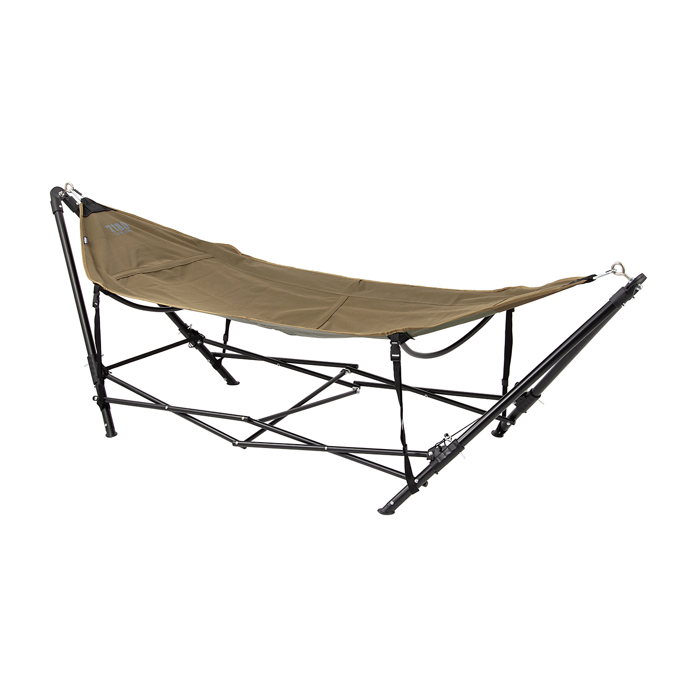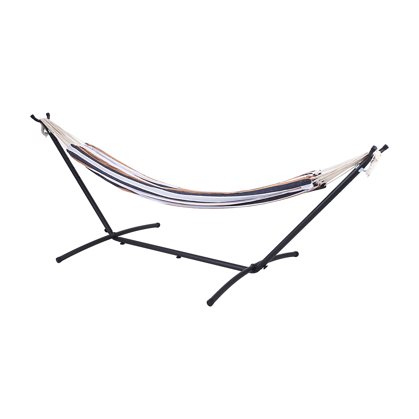 数多くのハンモックを販売するハンモック専門店、LifeFairの「自立式ハンモック」。ストライプの模様が特徴的な商品です。また、2人でも寝られると謳っており、大きなサイズが魅力です。展開時の長さ×幅は270×112cmと、非常に大きく体がすっぽりとおさまるサイズでした。また、柔らかい生地で肌触りも上々の評価。適度な張り心地でフィット感がよく、寝返りも打ちやすかった印象です。加えて、寝返りを打ってもハンモックがぐらぐらしなかったので、安定性の高さも高評価につながった要因の1つでしょう。専用のチェアはないものの、柔らかな生地はフィット感がよく全体的に包み込まれるような感覚があったとの声が多く挙がりました。また、布の横幅が広く作業をしやすかったことや、深く座れたこと、安定感があり土台やフレームが動かなかったところも、高評価につながった要因といえます。とにかく、寝心地座り心地がよく、チェアに付け替える必要もない自立式ハンモック。ハンモックでダラダラゆらゆらしたい人は、これを買っておけと自信を持っておすすめできる、ベストバイです。