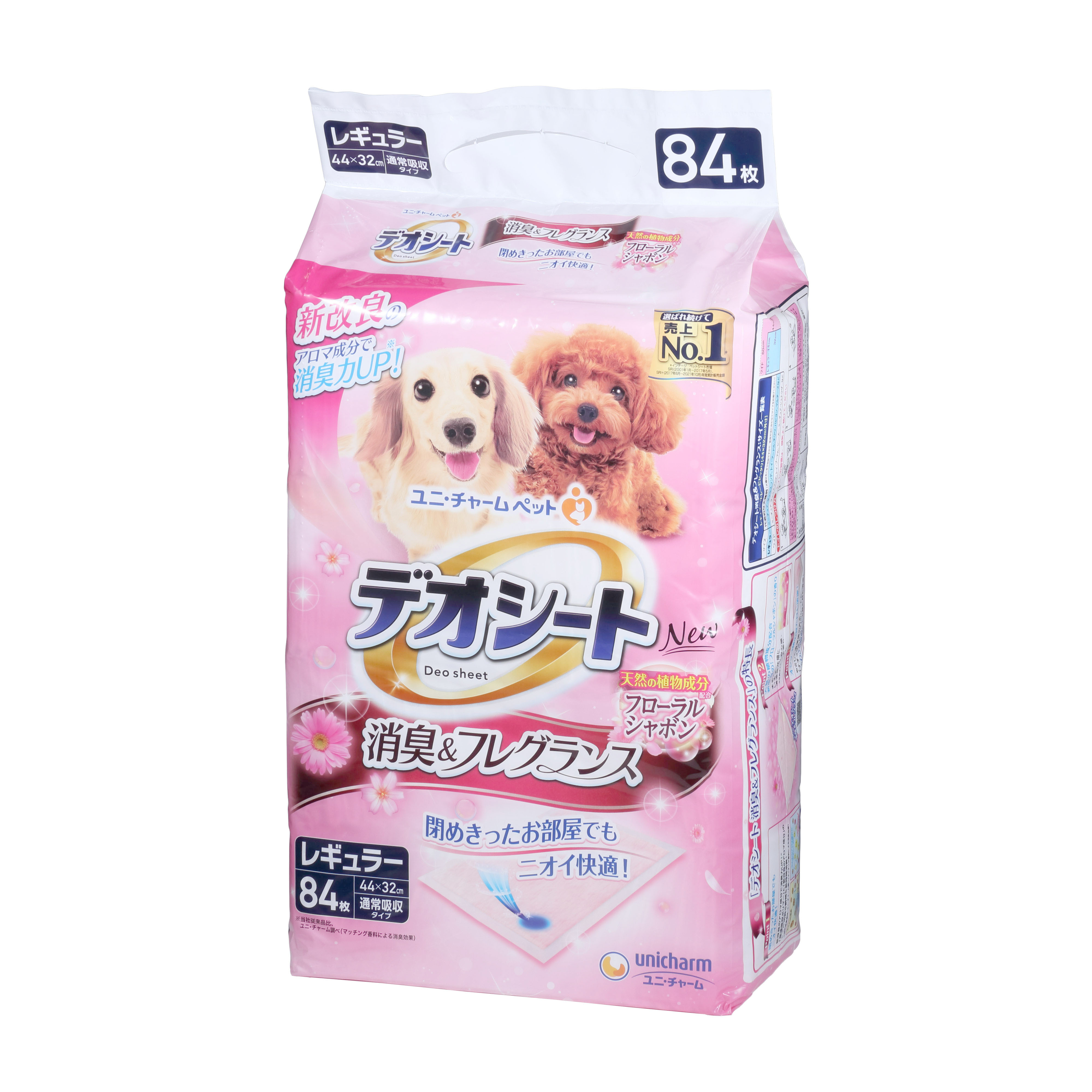 「デオシート 消臭&フレグランス フローラルシャボンの香り」は、ユニ・チャームから販売されています。アロマ成分により消臭力を高め、香りには天然の植物成分を配合していると謳っています。1回分のおしっこの広がりをシーツの1/3以内にとどめたので、スポット吸収力は優れているといえます。シーツ1枚で3回分のおしっこを余裕を持って吸収できるでしょう。濡らした直後は少し湿り気を感じたものの、3分後にはサラッと乾ききったため優れた速乾力といえます。吸収力の検証では、ほんのわずかに水分の逆戻りを確認。全体重がかかった場合、わずかに犬の体におしっこが付着する可能性はあるものの、床や家具など他の場所まで汚してしまうほどではないでしょう。消臭力の検証では完全消臭とまではいきませんでしたが、時間の経過とともに徐々に消臭効果を高めました。おしっこをかけた1分後はおしっこ臭が強くにおったものの、90分後にはフローラルの香りが立ち、8時間後にはおしっこ臭をカバー。即効力には欠けたものの、長時間の消臭力には優れているといえます。表面が不織布で覆われており、破れにくい印象。検証では少し傷がついたものの破れるほどではなく、ある程度のひっかきには耐えられるといえます。一方裏面は1回目のひっかきで破れるなど、十分とはいえない結果に。シーツを引っ張り出されないよう、工夫をするのがベターといえるでしょう。