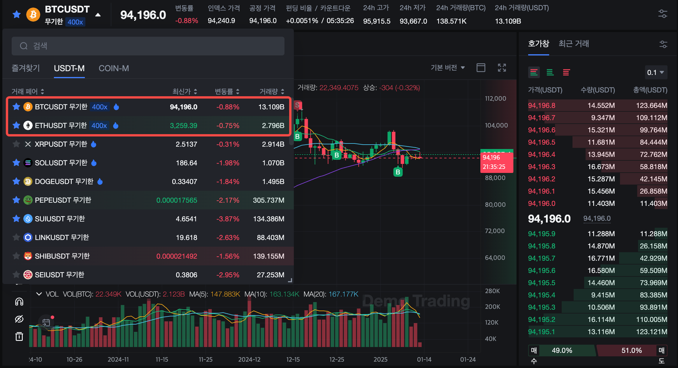 2단계: 400배 레버리지를 지원하는 선물 페어를 선택합니다. 현재 지원되는 페어는 BTCUSDT와 ETHUSDT입니다.