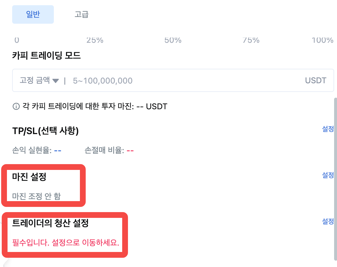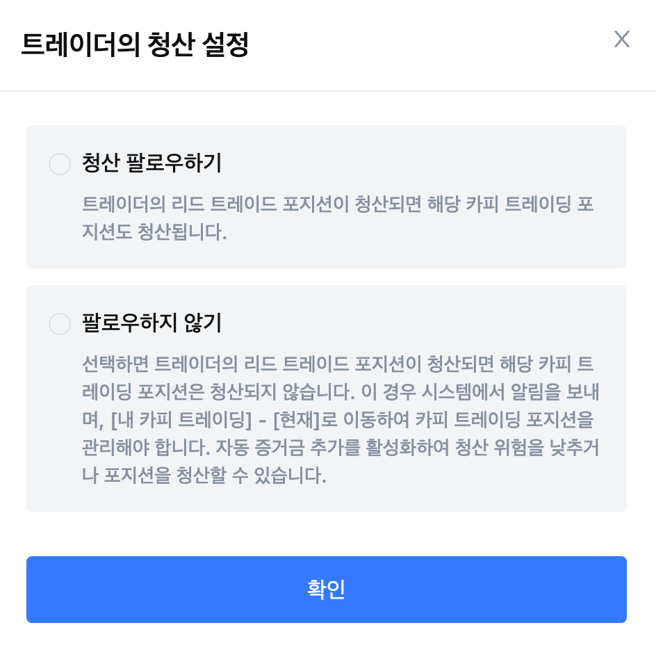- 트레이더의 청산 설정: 트레이더의 리드 거래 포지션이 청산될 때 해당 카피 트레이딩 포지션을 따라 청산하는 [청산 팔로우하기]를 선택하거나, 트레이더의 리드 거래 포지션이 청산될 때 해당 카피 트레이딩 포지션을 따라 청산하지 않는 [팔로우하지 않기]를 선택할 수 있습니다.
