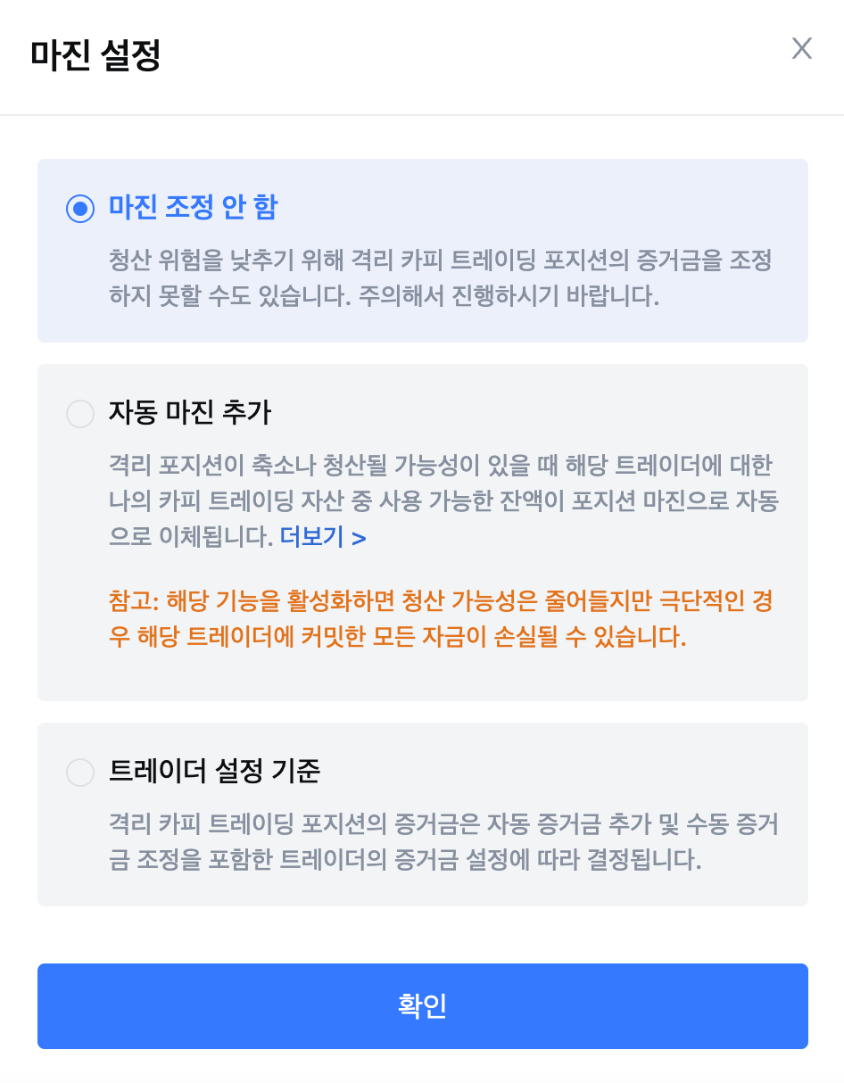 - 마진 설정: 새로운 마진(증거금) 설정 옵션 - [트레이더의 청산 설정]
