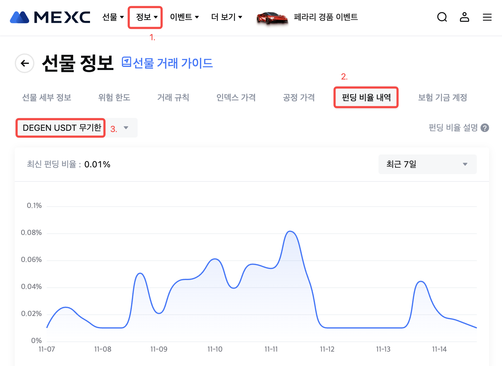 2024년 11월 14일 23:10 (KST)부터 MEXC 선물은 DEGEN USDT-M 선물의 펀딩 비율 정산 빈도를 4시간마다 한 번씩 조정합니다. 자세한 사항은 다음과 같습니다.