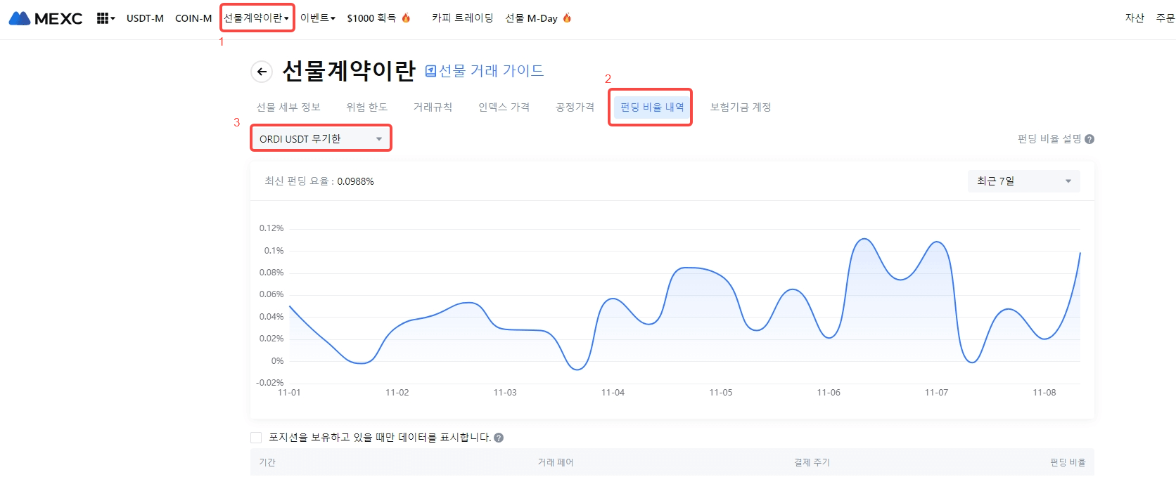 시간 (KST) | ORDIUSDT 선물 최대 펀딩 비율 |