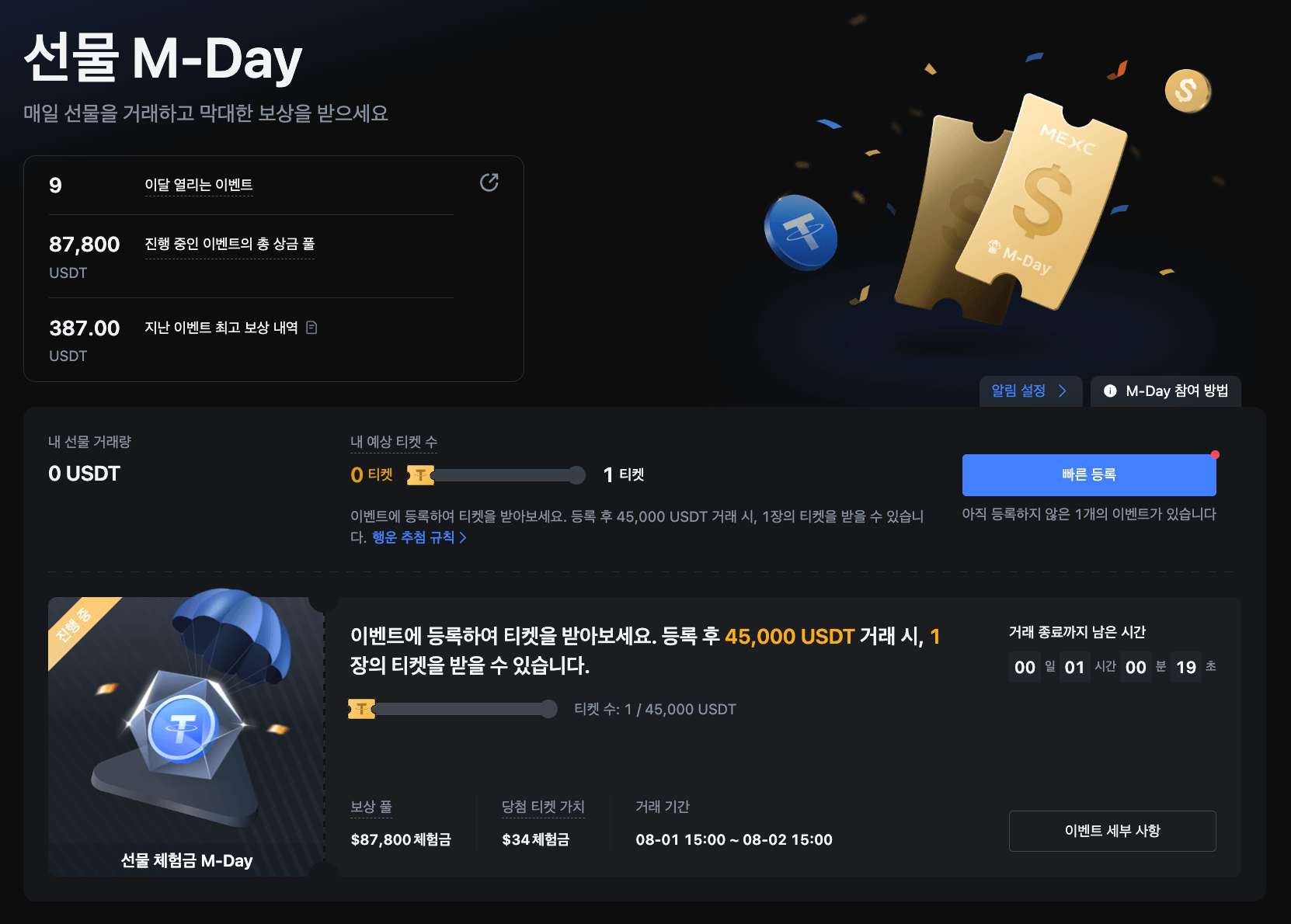 앞으로도 거래의 즐거움을 계속 누리실 수 있도록 MEXC는 여러분을 [M-Day] 이벤트에 진심으로 초대합니다. 선물 M-day의 총 보상 풀은 최대 87,800 USDT이며, 이벤트에는 당첨 보상, 추가 행운 보상, 참여 보상 및 기타 보상 등 다양한 인센티브가 마련되어 있습니다. 이벤트에 등록하고 선물을 거래하여 행운 추첨을 통해 매일 푸짐한 경품을 받아보세요!