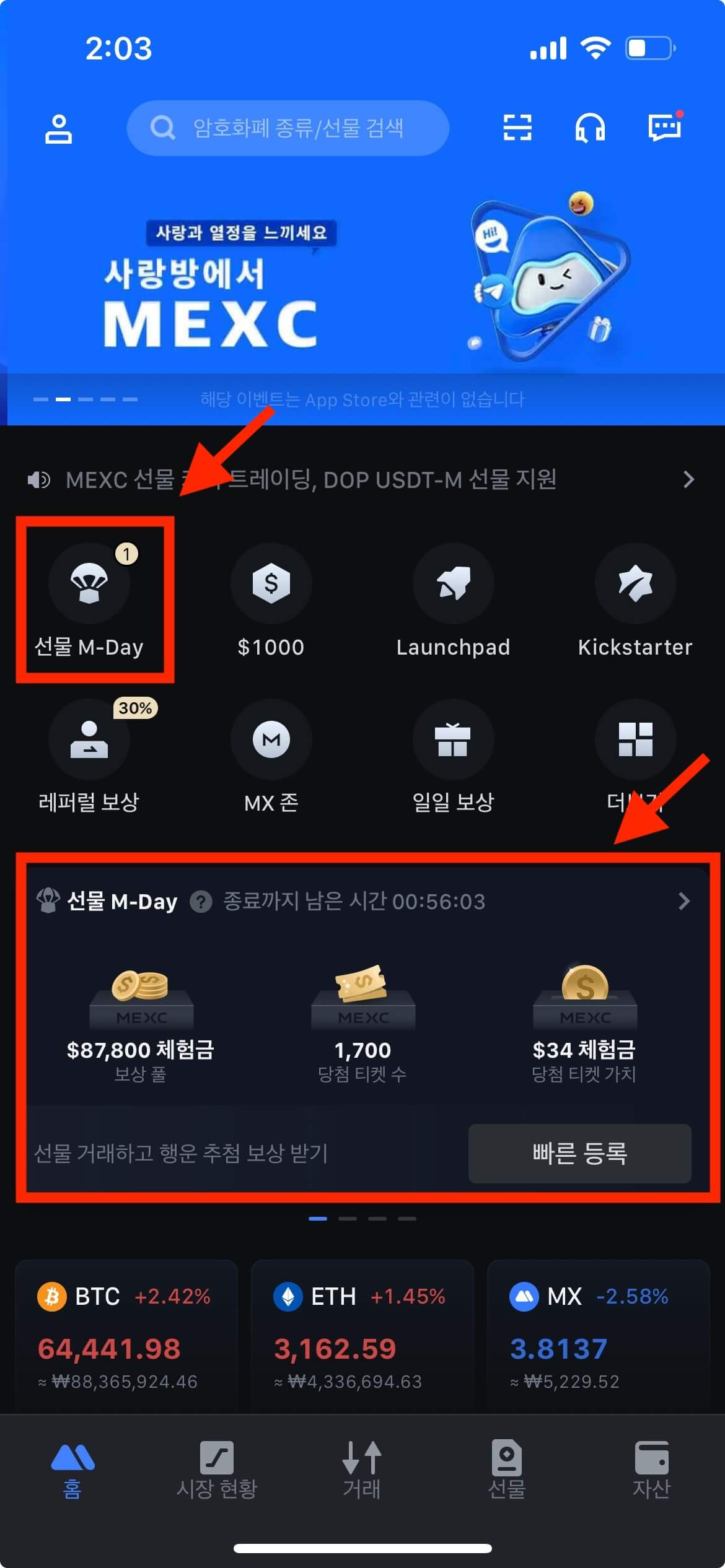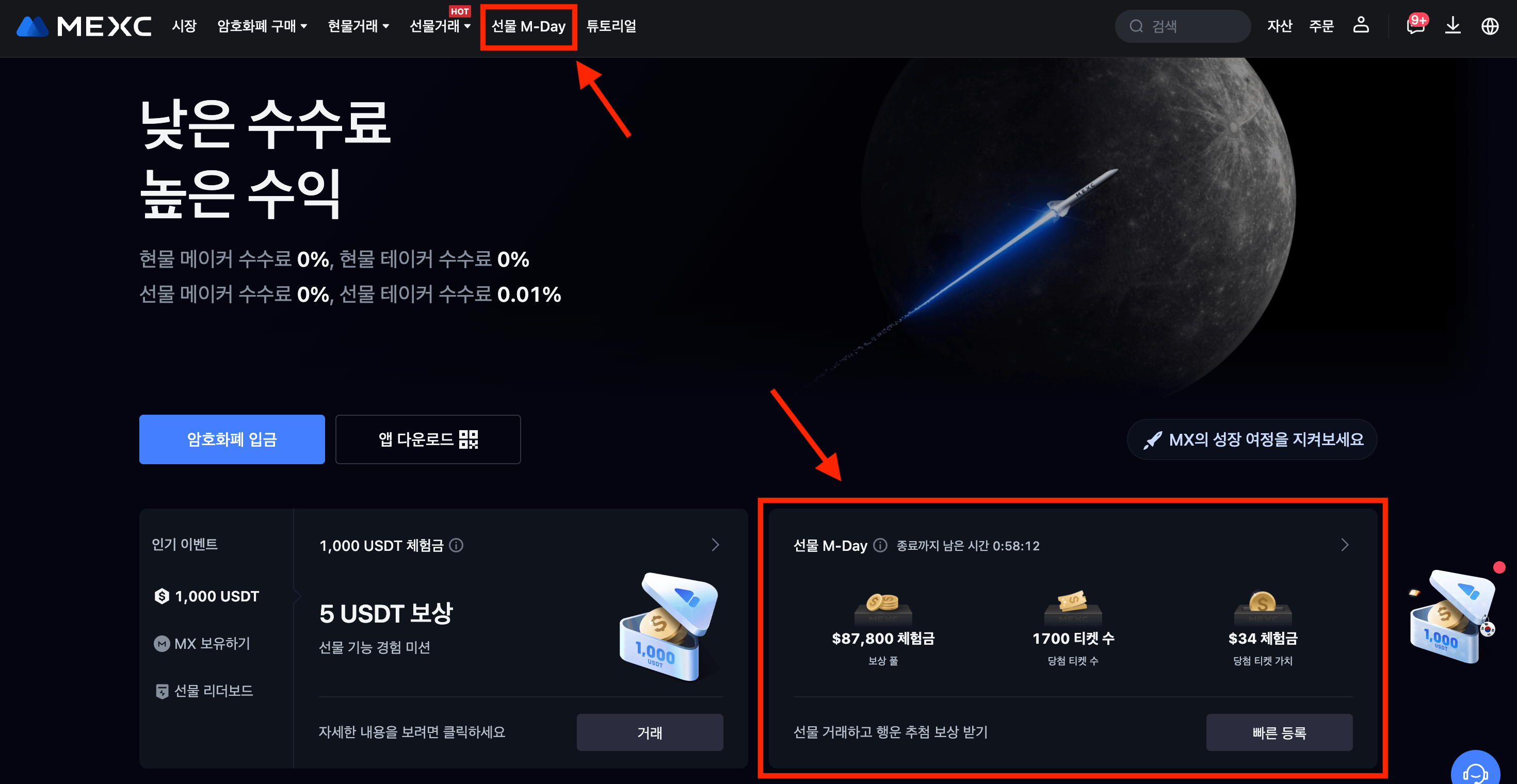 방법 2. MEXC 공식 홈페이지(www.mexc.com)로 이동하여 이벤트 카드에서 [선물 M-Day] 클릭