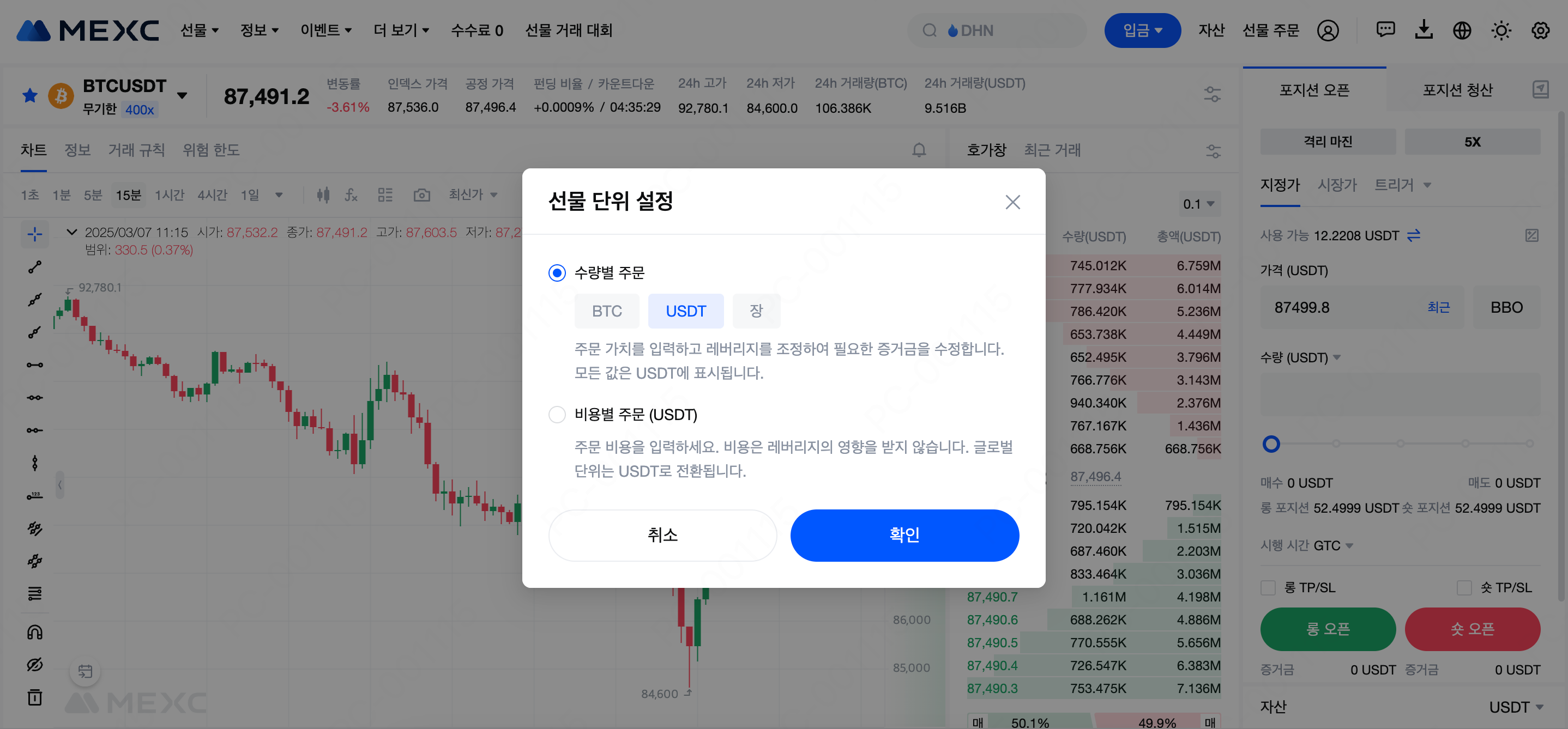 USDT 마진 선물 거래에서 계약 단위를 수량 또는 cont.로 설정하는 대신 USDT로 설정하면 포지션 내역에 표시되는 강제 청산 수량이 오픈 수량과 다를 수 있습니다.