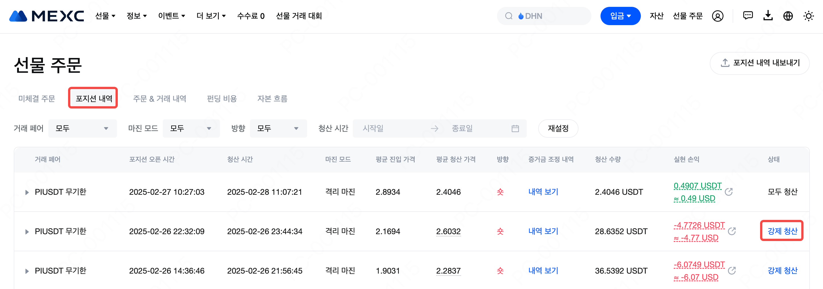 강제 청산 주문은 [포지션 기록] 섹션에서 확인할 수 있습니다.