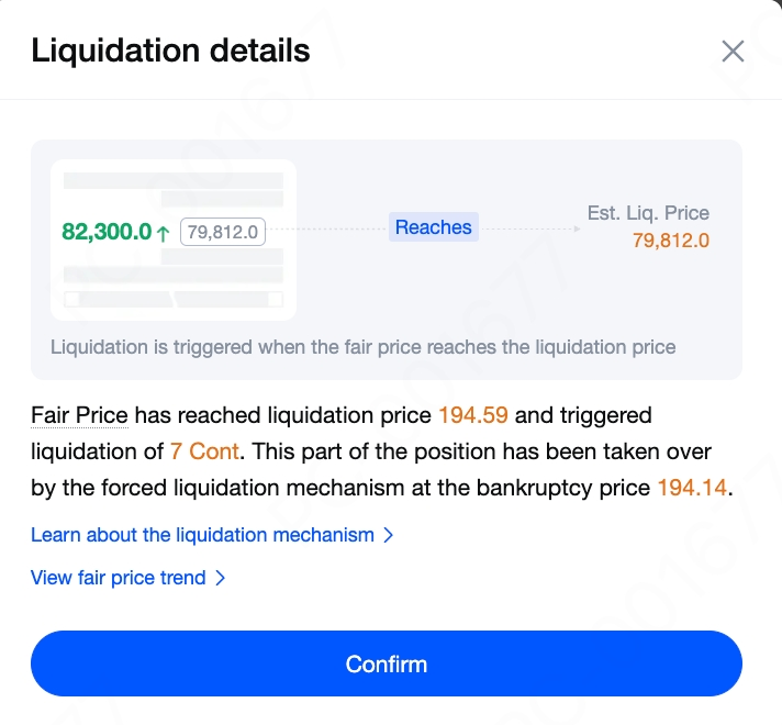 MEXC는 공정 가격을 청산 트리거로 사용합니다. 공정 가격이 청산 가격에 도달하면 청산 메커니즘이 활성화됩니다. 공정 가격을 기준으로 사용하면 시장 안정성을 높이고 비정상적인 시장 변동 기간 동안 불필요한 청산을 줄일 수 있습니다.