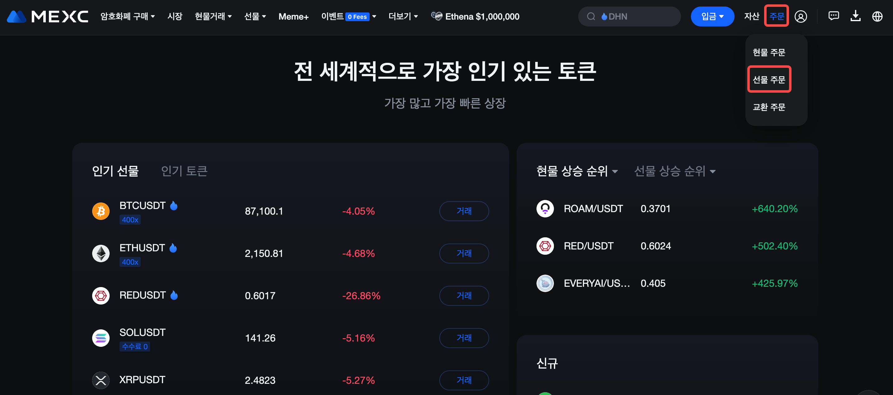 웹사이트에 로그인하고 오른쪽 상단 탐색 표시줄의 주문에서 선물 주문을 클릭합니다.