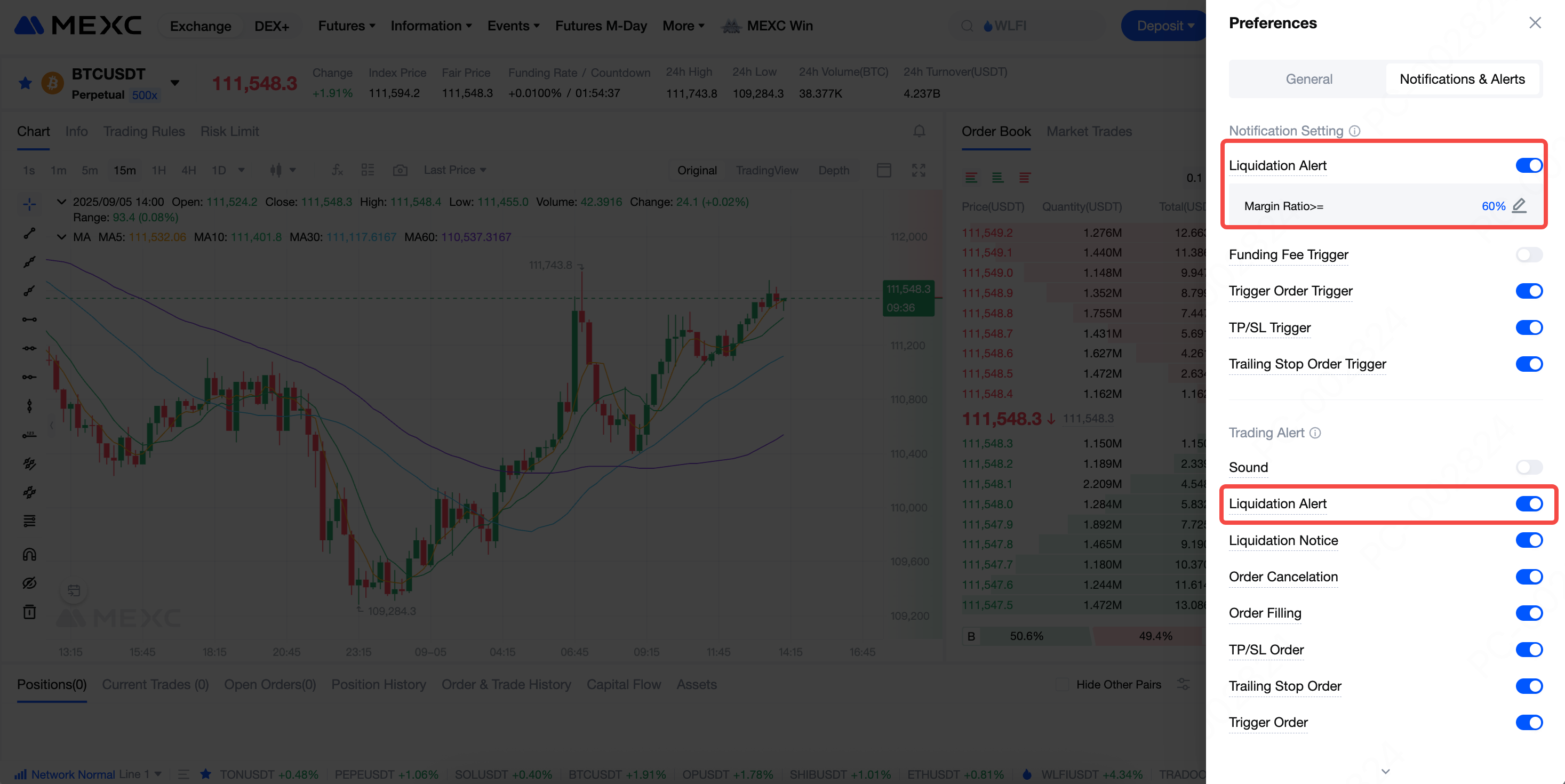 선물 거래 페이지의 설정에서 강제 청산 알림을 활성화하고 증거금률 임계값을 설정할 수 있습니다. 포지션의 유지 증거금률이 설정한 임계값에 도달하거나 이를 초과하면 MEXC가 알림을 발송합니다. 각 포지션은 30분마다 최대 1회 알림을 받을 수 있습니다.