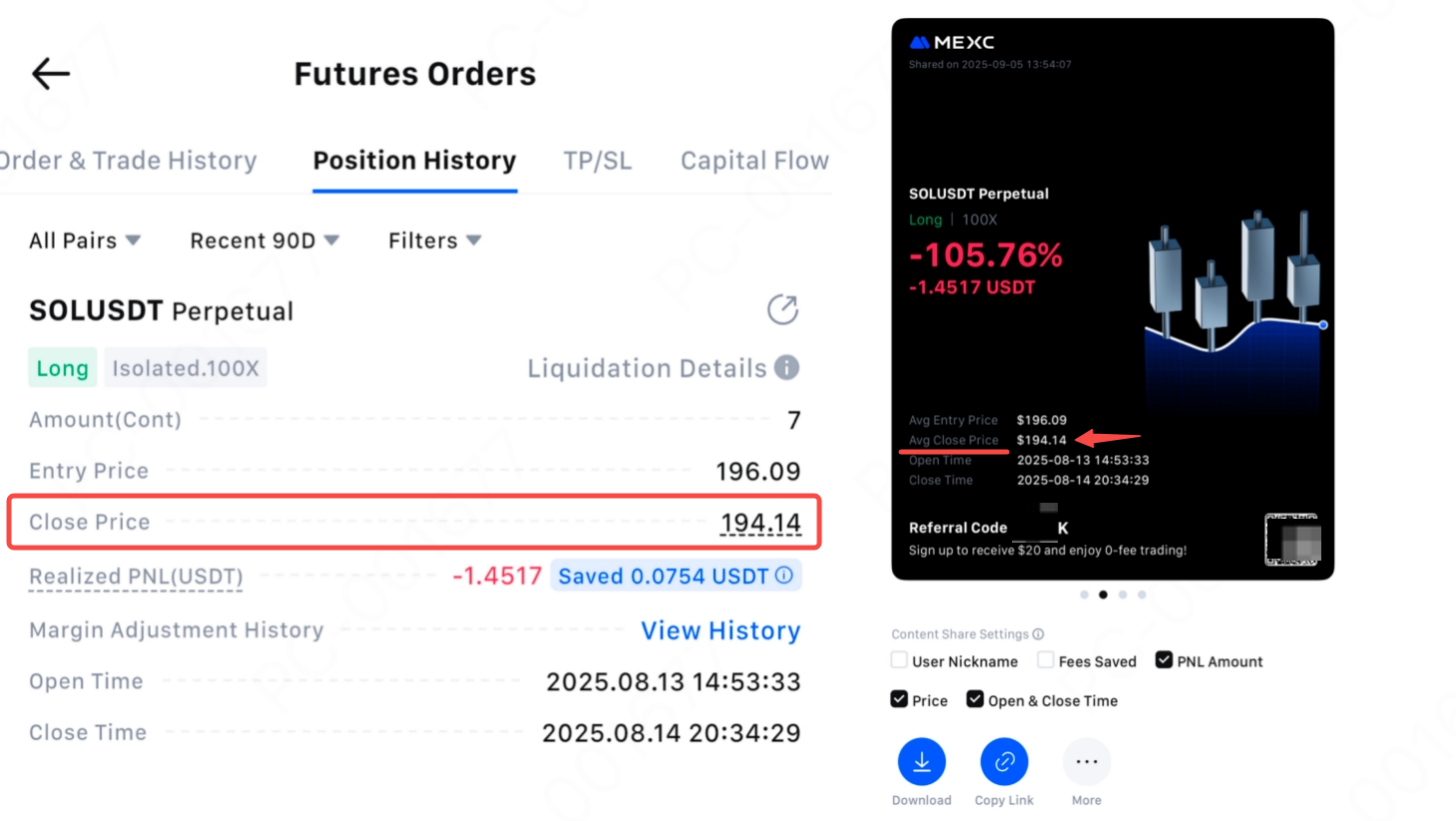 청산 후 | 100배 | / | / | 137.263 USDT | 194.59 USDT | 194.14 USDT |