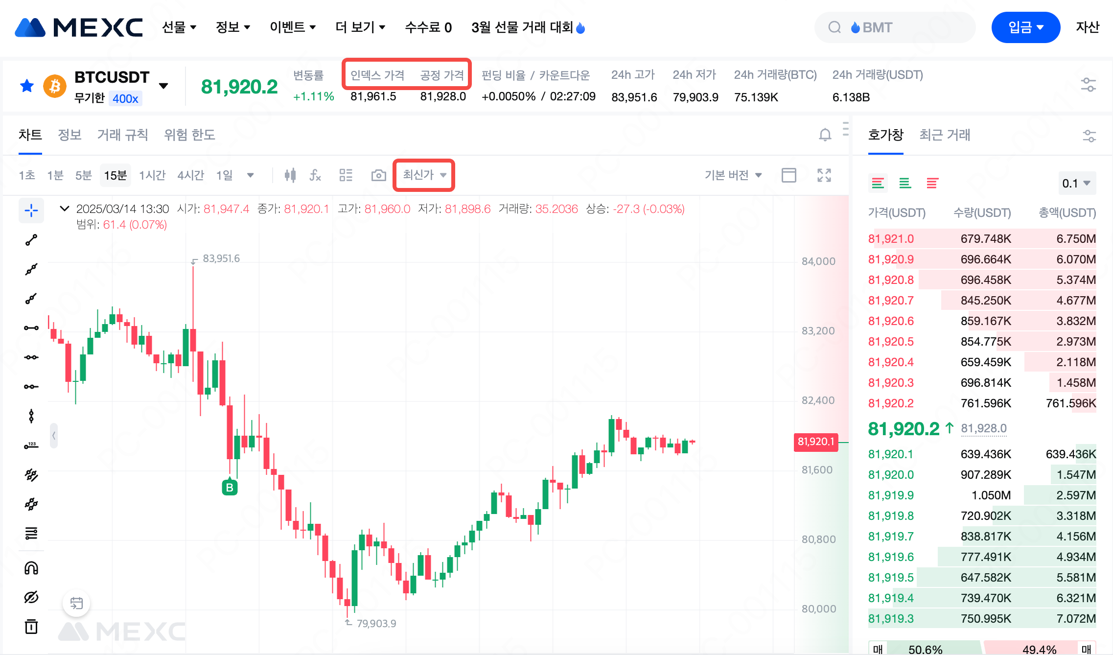 사용자는 거래 페이지 상단에서 현재 공정가격과 설명을 확인할 수 있습니다. 또한 캔들 차트 상단에서 공정 가격, 최신가, 인덱스 가격 사이를 전환하여 세 가지 가격의 추세를 쉽게 추적할 수 있습니다.