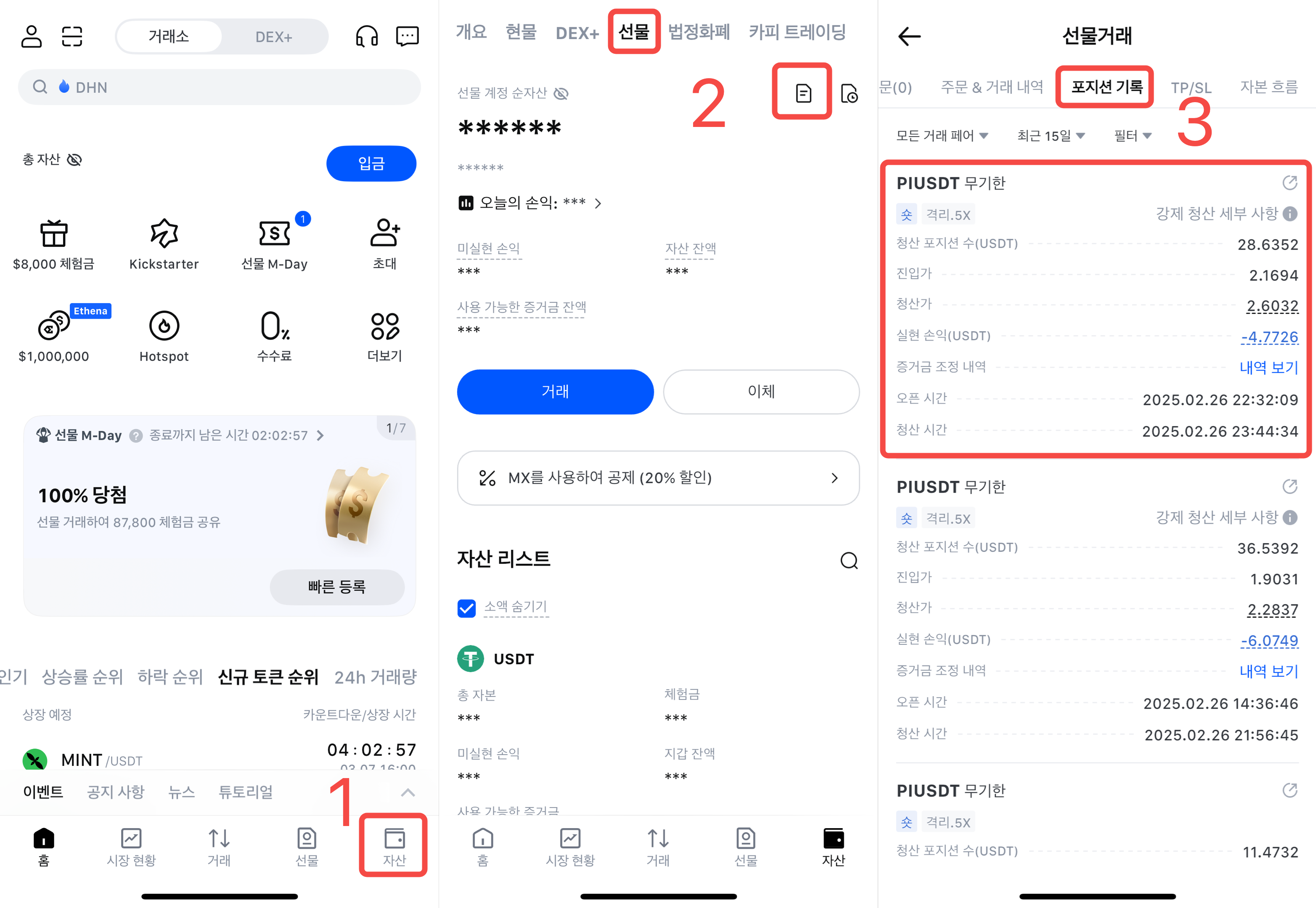 1)MEXC 앱에 로그인하고 하단의 자산을 탭하여 자산 페이지로 들어갑니다.