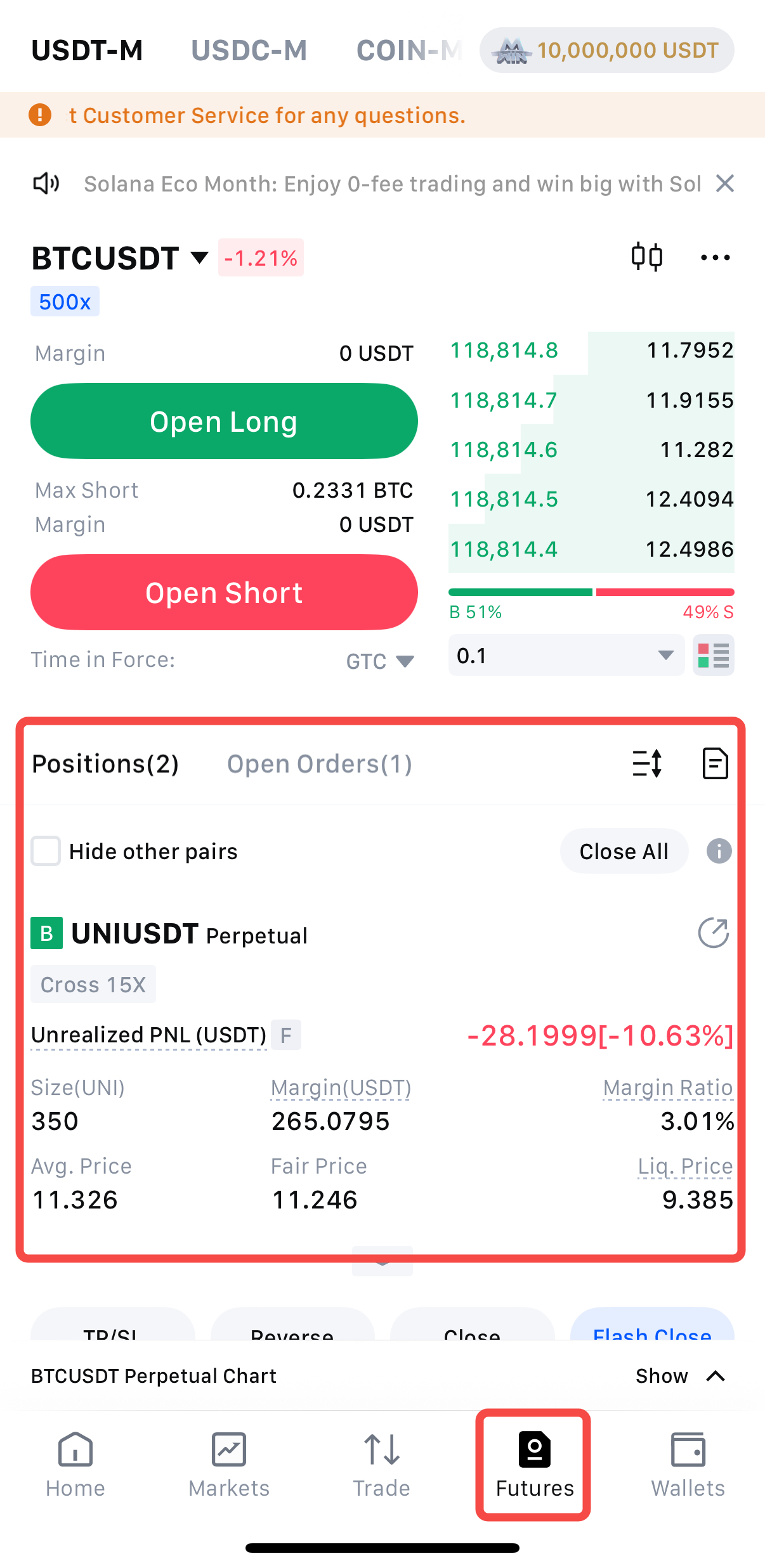 사용자는 선물 거래 인터페이스 하단에서 현재 오픈 포지션을 확인할 수 있습니다. 포지션 규모, 예상 청산 가격, 미실현 손익 등의 정보가 표시됩니다. 또한, 사용자는 포지션에 증거금을 추가하여 강제 청산 위험을 줄일 수 있습니다.