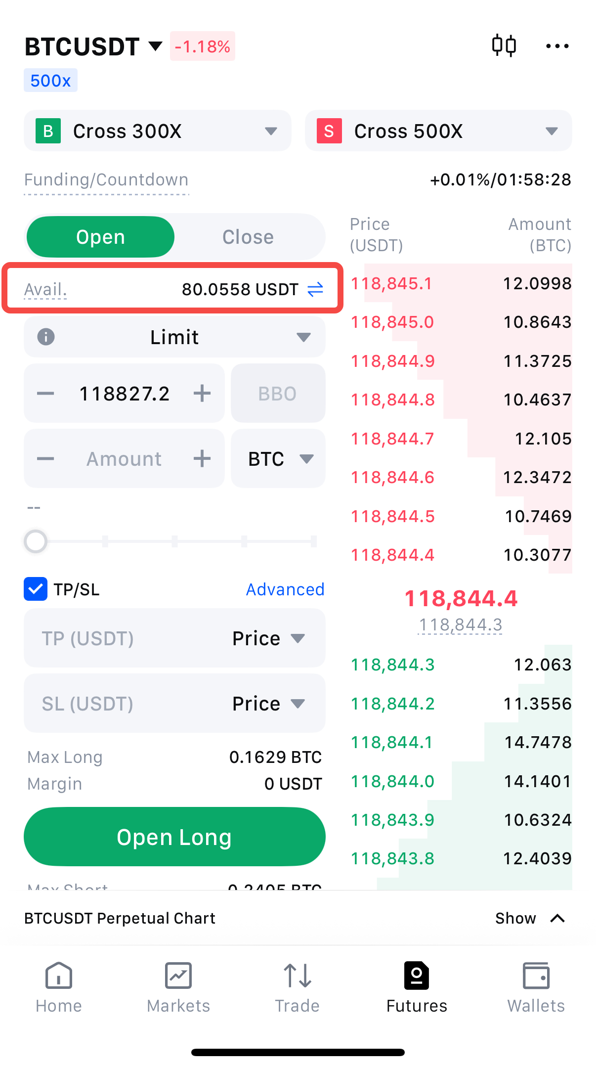 사용자는 선물 거래 인터페이스의 '사용 가능' 섹션에서 사용 가능한 자산을 확인할 수 있습니다.