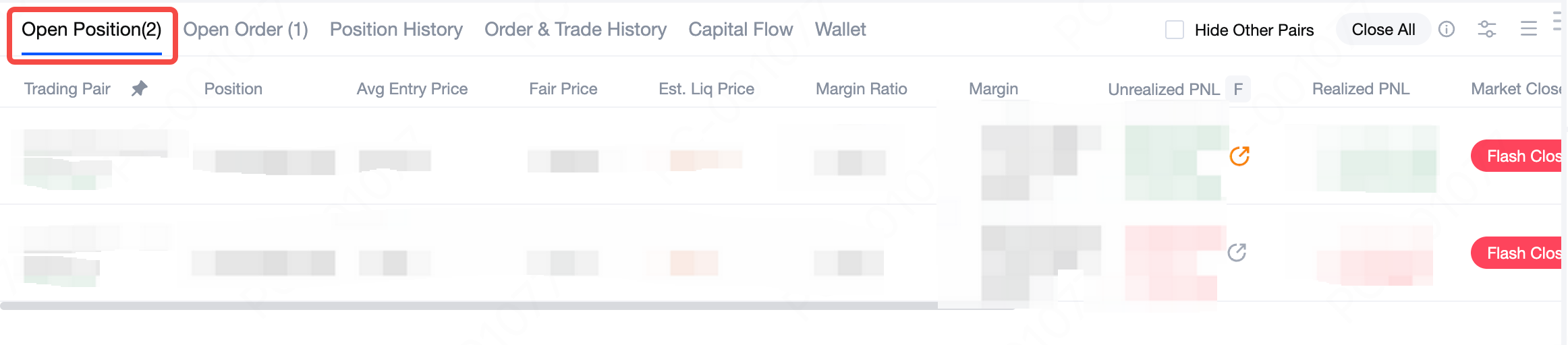 여기에서 사용자는 거래 페어 전체의 모든 오픈 포지션을 확인할 수 있습니다.