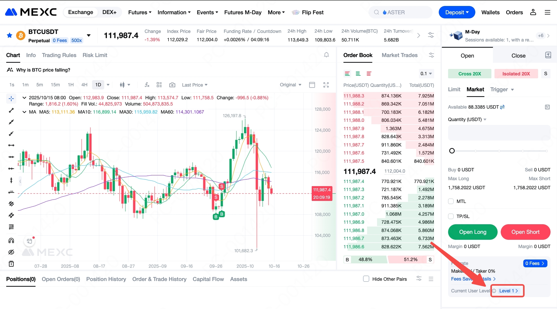 또한, 특정 MEXC 무기한 선물 거래 페어는 다양한 수준의 사용자 간 활발한 거래를 장려하기 위해 등급별 수수료 구조를 적용합니다. 수수료율은 지역에 따라 다를 수 있으므로, 선물 거래 페이지에서 현재 사용자 레벨과 해당 수수료 등급을 확인하실 수 있습니다. 거래량이 증가함에 따라 더 유리한 수수료율이 적용되는 상위 단계로 이동하게 되며, MEXC의 풍부한 유동성과 강력한 시장 깊이를 지속적으로 활용하실 수 있습니다.