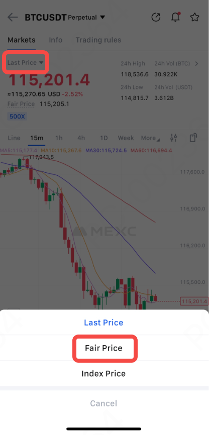 MEXC 웹 플랫폼에서는 캔들스틱 차트 상단에서 공정 가격을 선택하여 공정 가격을 직접 모니터링할 수 있습니다. 이 기능은 포지션 관리 시 투명성과 통제력을 한층 높여줍니다.