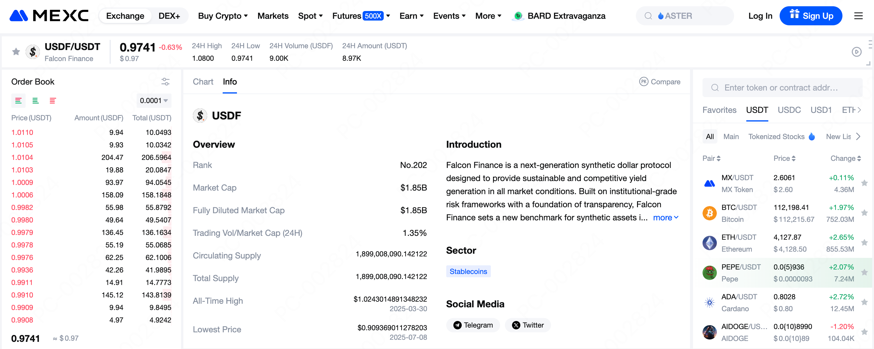 USDf는 이더리움 기반의 초과 담보 합성 달러로, 현재 유통량은 약 18.99억 개이며 시가 순위는 202위입니다.