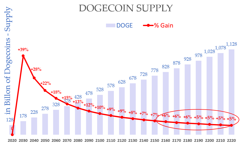 Key Takeaways Dogecoin (DOGE) is a decentralized peer-to-peer cryptocurrency with no maximum supply cap. Dogecoin’s supply grows at a fixed rate of about 5 billion new DOGE each year through miningKey Takeaways Dogecoin (DOGE) is a decentralized peer-to-peer cryptocurrency with no maximum supply cap. Dogecoin’s supply grows at a fixed rate of about 5 billion new DOGE each year through mining