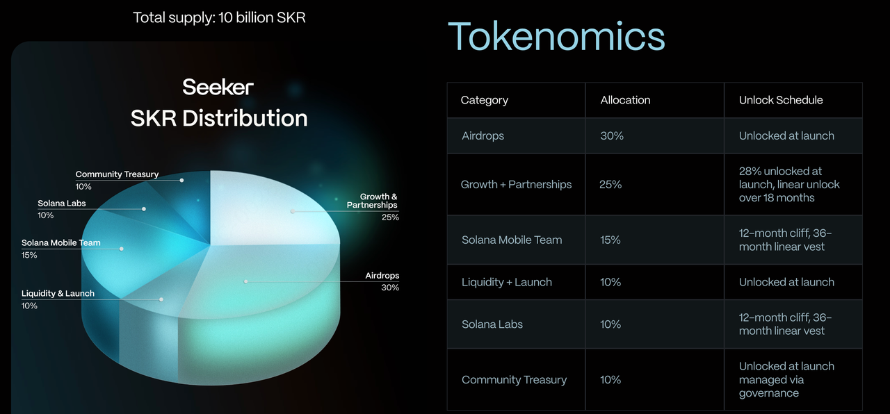According to the official tokenomics, SKR Token has a total supply of 10 billion tokens. Of this amount, 30% is reserved for community airdrops, with two-thirds of the initial distribution specifically allocated to Solana Seeker users and developers.