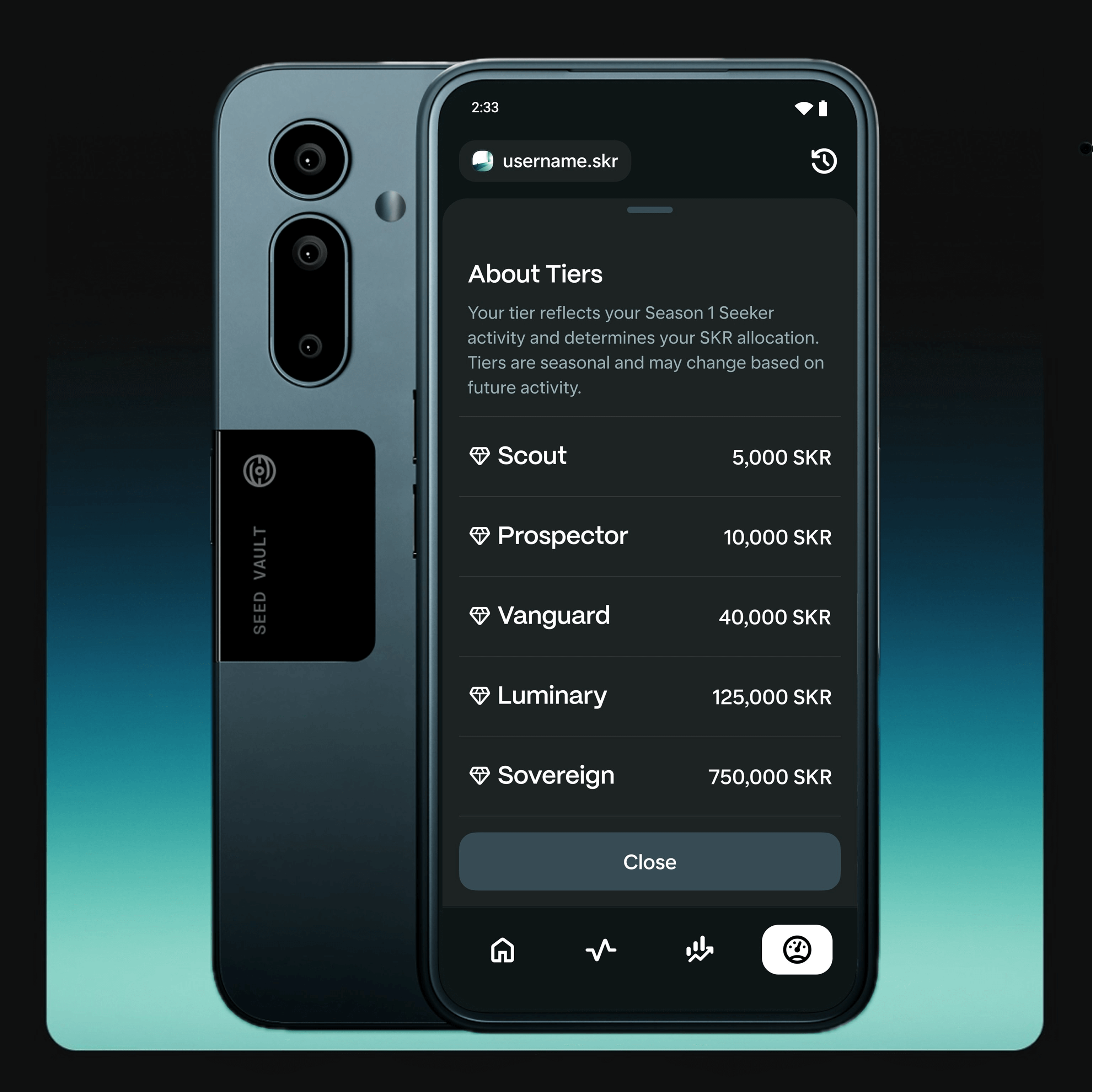 This tiered structure is designed to incentivize deep user engagement within the Seeker ecosystem, including active use of the Solana dApp Store, participation in on-chain activities, and frequent device interaction. The system determines each user's tier based on behavioral data recorded during Airdrop Season 1.