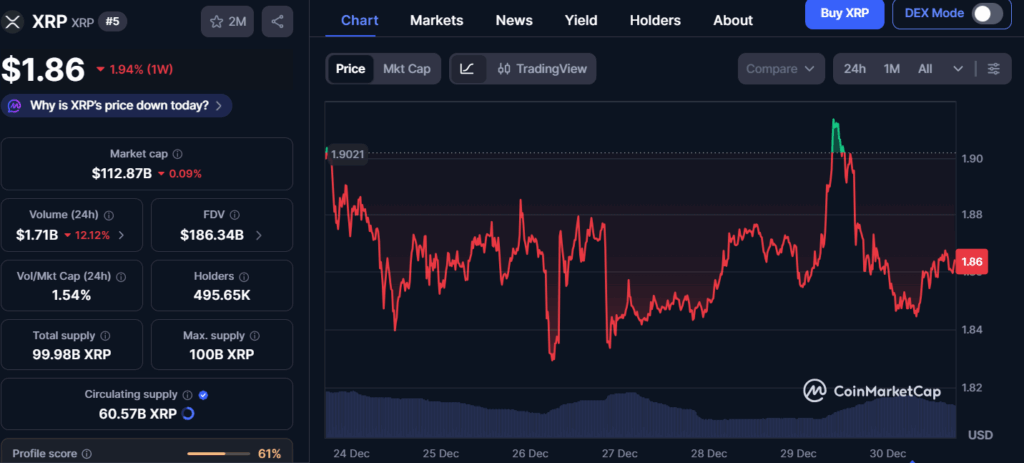 Then, today, it is followed by a pullback. At the time of writing, XRP is trading at $1.86, a decline of around 0.15%, emphasizing the gap between cautious spot-market trading and consistent institutional accumulation.