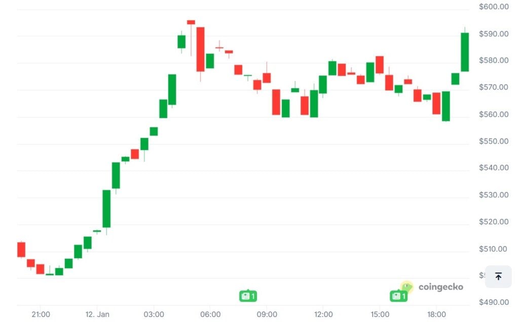 At the time of writing, the token is trading at $557, having initially cleared both the 2018 and 2021 highs to attain a peak of $596 earlier today.