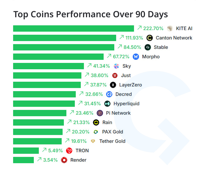 The 90-day performance list sitting beneath that index reading creates an immediate contradiction. KITE AI leads with 222.70% gains over 90 days. Canton Network follows at 111.9%. Stable at 84.5%, Morpho at 67.72%, Sky at 41%, Just at 38%, LayerZero at 37.8%, Decred at 32%, Hyperliquid at 31.45%, Pi Network at 23%, Rain at 21%, PAX Gold at 20.2%, and Tether Gold at 19.6% complete the top performers.