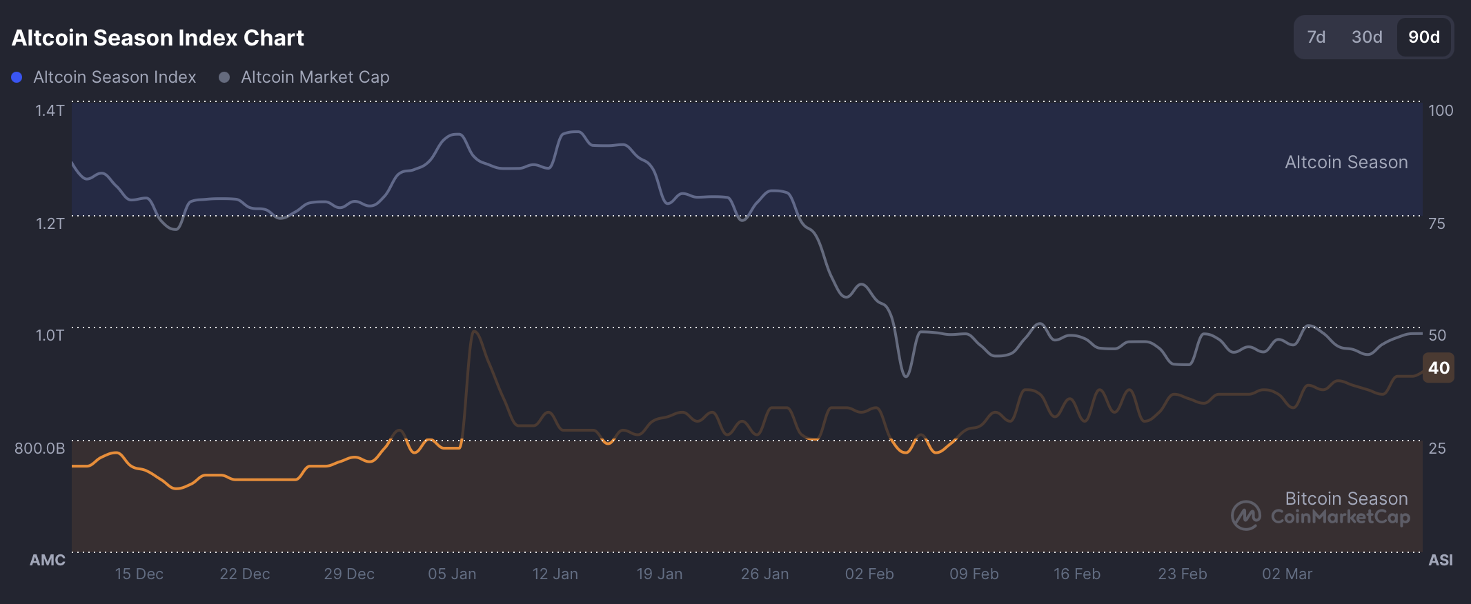 CoinMarketCap’s Altcoin Season Index sits at 40 out of 100 on March 12, firmly in Bitcoin Season territory where the majority of top assets are underperforming CoinMarketCap’s Altcoin Season Index sits at 40 out of 100 on March 12, firmly in Bitcoin Season territory where the majority of top assets are underperforming