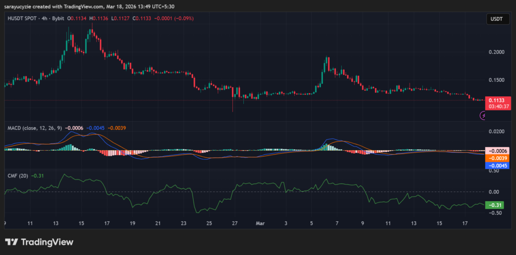 The Moving Average Convergence Divergence (MACD) is below the signal line, and both are below zero, which shows the Humanity Protocol market is under clear bearish pressure. The sellers are in control, and the recent price is weaker than the overall trend. As long as this setup holds, the downtrend is likely to continue.