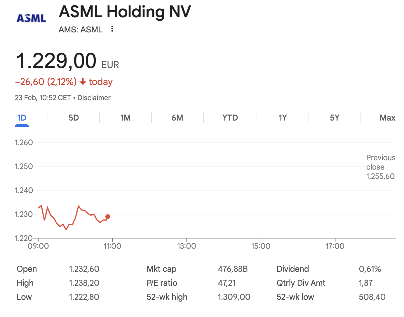 Aandelenkoers ASML onderuit. Bron: Google Finance