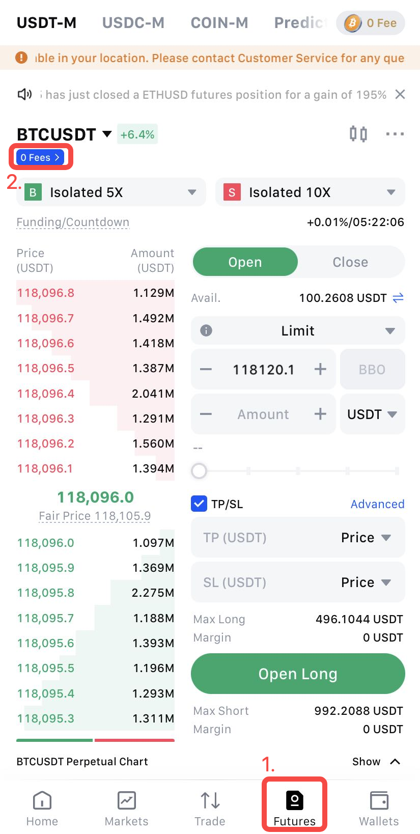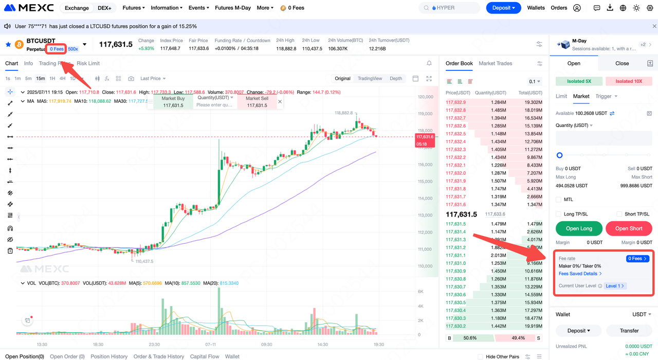 Após iniciar sessão, acesse a página de negociação de Futuros e procure a tag 0 Fees logo abaixo do par de negociação ou localize a seção Taxa no canto inferior direito.