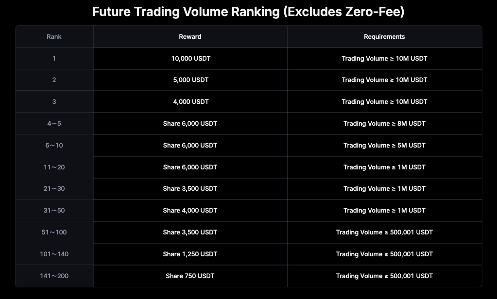 Atinja pelo menos 100,000 USDT em volume de negociação para se qualificar para a tabela de classificação. Aumente seu volume de negociação para subir na classificação e ganhar recompensas de acordo com sua posição. Detalhes conforme a tabela: