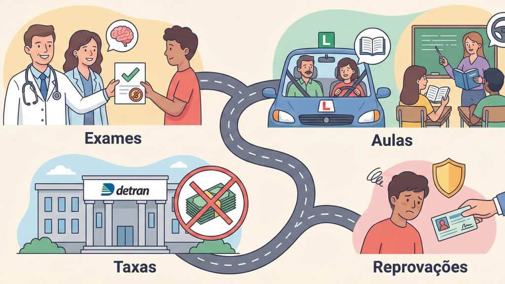 O pacote de gratuidade é abrangente, cobrindo praticamente todas as etapas necessárias para que o cidadão saia com o documento em mãos. O governo assume os custos das taxas administrativas, exames médicos e psicotécnicos, além de pagar pelas aulas teóricas e práticas na autoescola credenciada.