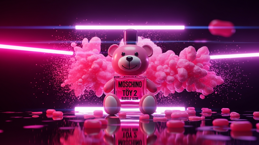 Entre os três, o Moschino Toy 2 Bubble Gum é o que mais se aproxima do universo pop e divertido. O conceito principal é inspirado em chiclete de tutti-frutti, com um cheiro adocicado que remete a doces e guloseimas de infância.