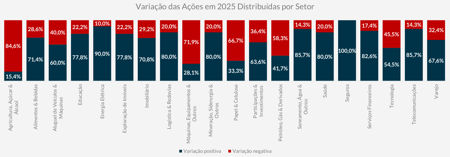 Em contrapartida, as small caps — empresas com valor de mercado inferior a R$ 1 bilhão — enfrentaram maior volatilidade. Nesse grupo, 64,4% das empresas fecharam o ano com variações negativas em suas ações.