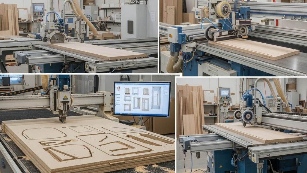 Softwares de corte otimizado desenham as peças na chapa para reduzir drasticamente o desperdício de material. Serras de precisão cortam os painéis com exatidão para garantir o encaixe perfeito na montagem final. Logo depois, coladeiras de borda aplicam fitas de PVC que protegem a madeira contra umidade.