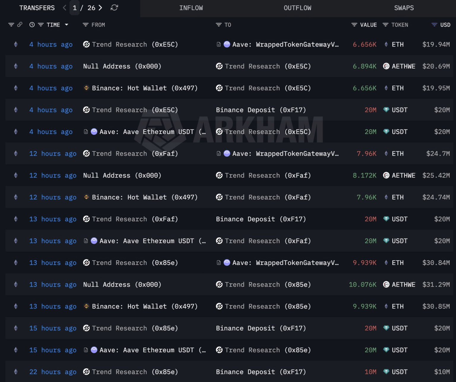 Além disso, os registros da blockchain revelam movimentos repetidos entre Aave, Binance e Trend Research, formando um padrão de reposicionamento estratégico. As transações sugerem alavancagem controlada e rotação de capital, e não simples especulação de curto prazo.