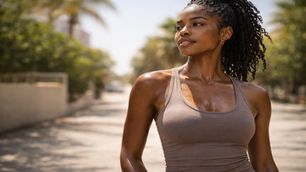 A regata de poliamida é outra peça que atua como aliada direta contra o calor extremo. A poliamida é leve, lisa ao toque e eficiente na evaporação do suor, e o formato sem mangas amplia a circulação de ar, ajudando a manter a temperatura corporal mais estável.
