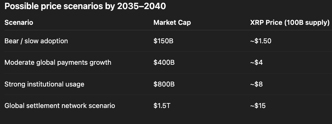 Num cenário de crescimento moderado, com expansão da liquidez baseada em XRP e maior uso em pagamentos internacionais, a capitalização poderia alcançar US$ 400 bilhões.