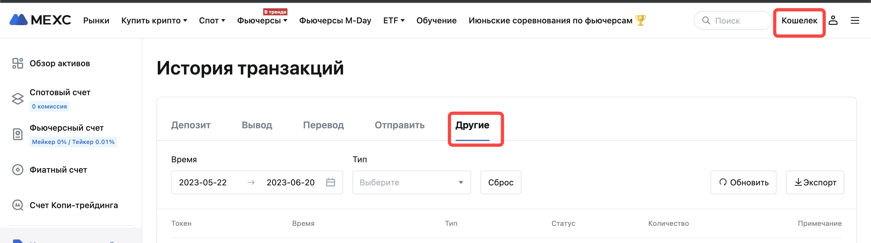 Войдите в свою учетную запись MEXC — нажмите «Кошелек» — нажмите «История» — нажмите «Другие».