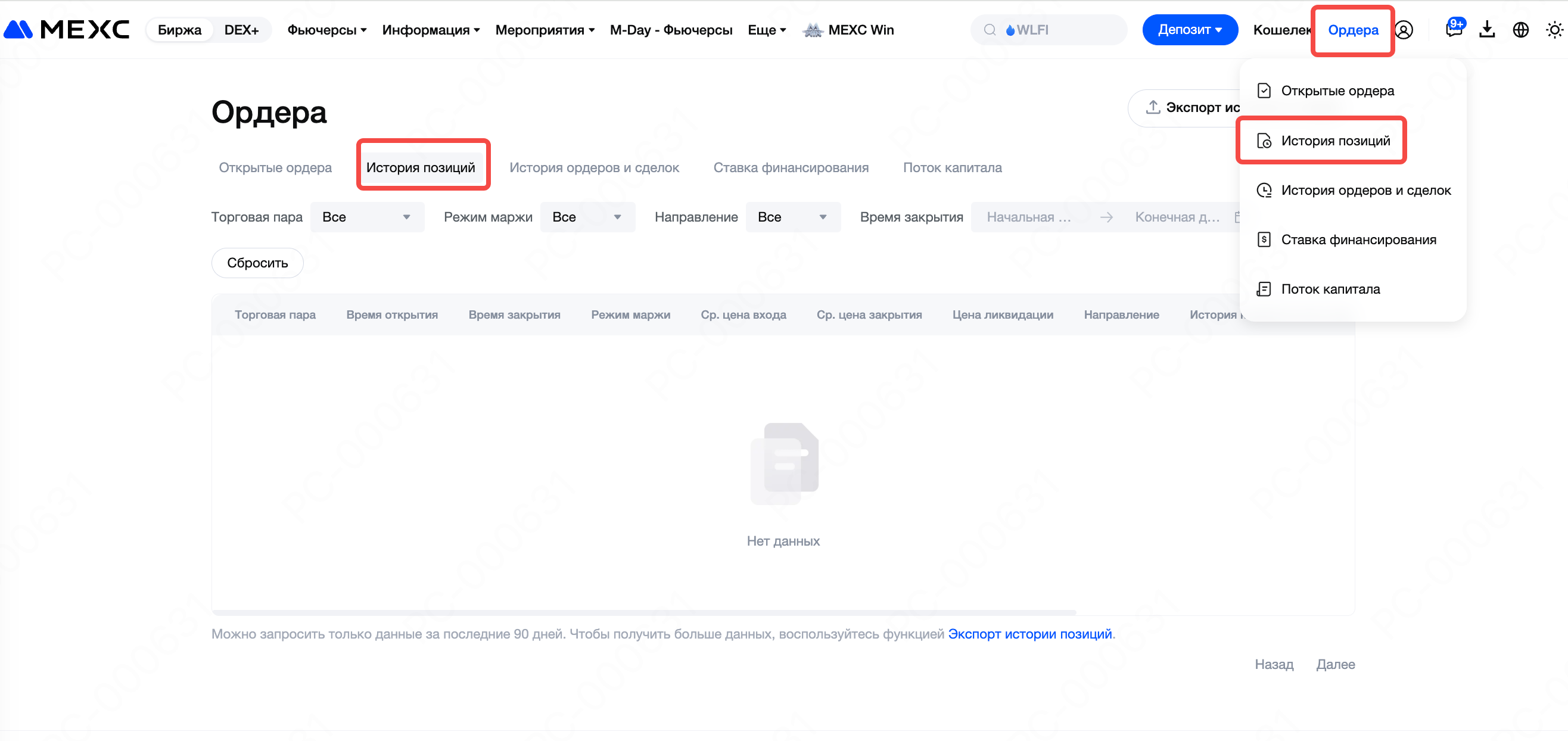 Если вы хотите просмотреть свои прошлые сделки, перейдите в правый верхний угол и выберите «Ордера» → «История позиций».