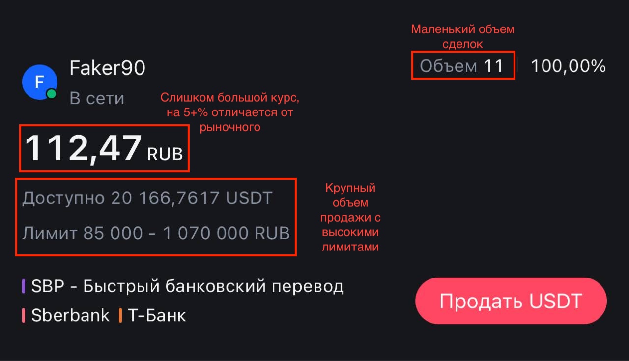 ✔️ Проверяйте историю сделок контрагента (кол-во сделок, процент выполненных сделок, отзывы, является ли контрагент верифицированным мерчантом).