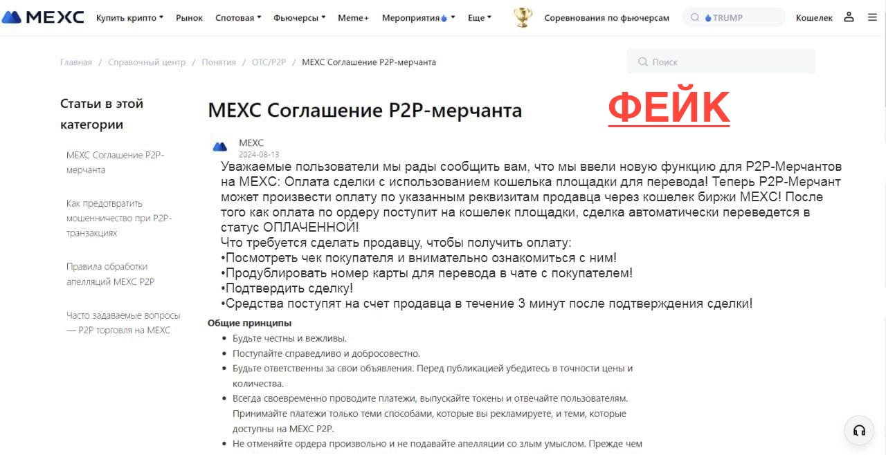 🔴 После создания ордера мошенник может спросить, ознакомились ли вы с условиями рекламной сделки, а затем отправить ФЕЙК документ "MEXC-P2P Merchant Agreement". В нем содержится ложная информация, призванная повысить доверие к мошеннику и ввести Вас в заблуждение. Вам внушают, что после завершения сделки перевод произойдет автоматически, заставляя вас внести деньги.