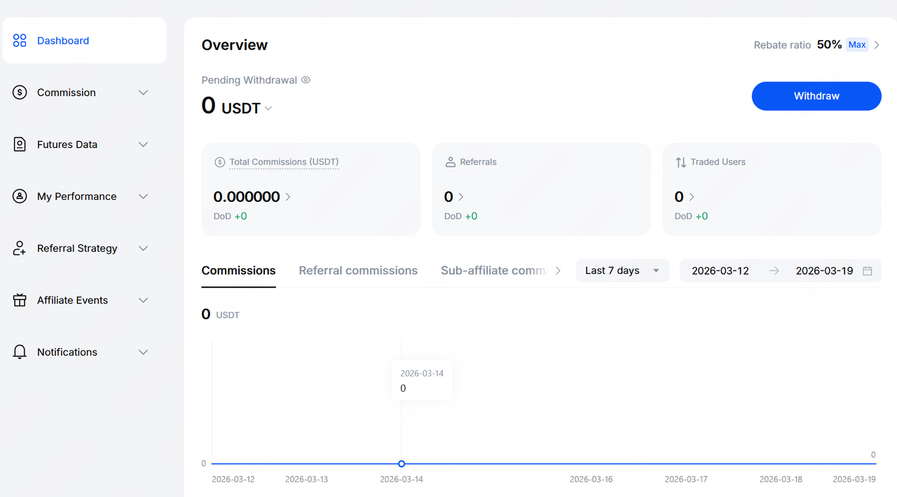 The platform follows a T+1 commission settlement mechanism. Commissions are generally distributed daily between 8:00 and 10:30 (UTC+8). In extreme cases, there may be slight delays due to the large volume of calculations.